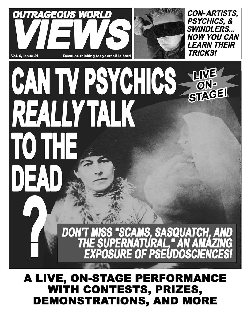 As a magician, Brian’s wise to all the tricks used by frauds, tricksters, and con artists …and now he’s ready to take YOU to scam school. This is no ordinary lecture: we’re talking hands-on experiments, a live performance of psychic surgery, free giveaways of cash and prizes, and all the secrets TV psychics DON’T want you to know.