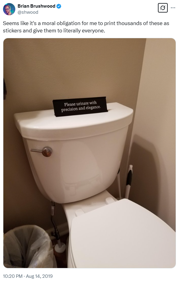 The $5 pack will have a bunch of stickers that say "Please Urinate With Precision and Elegance," just like that sign I found in the wild.