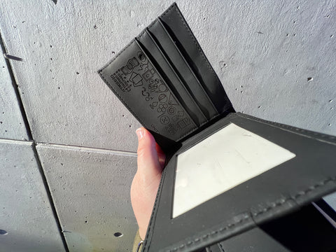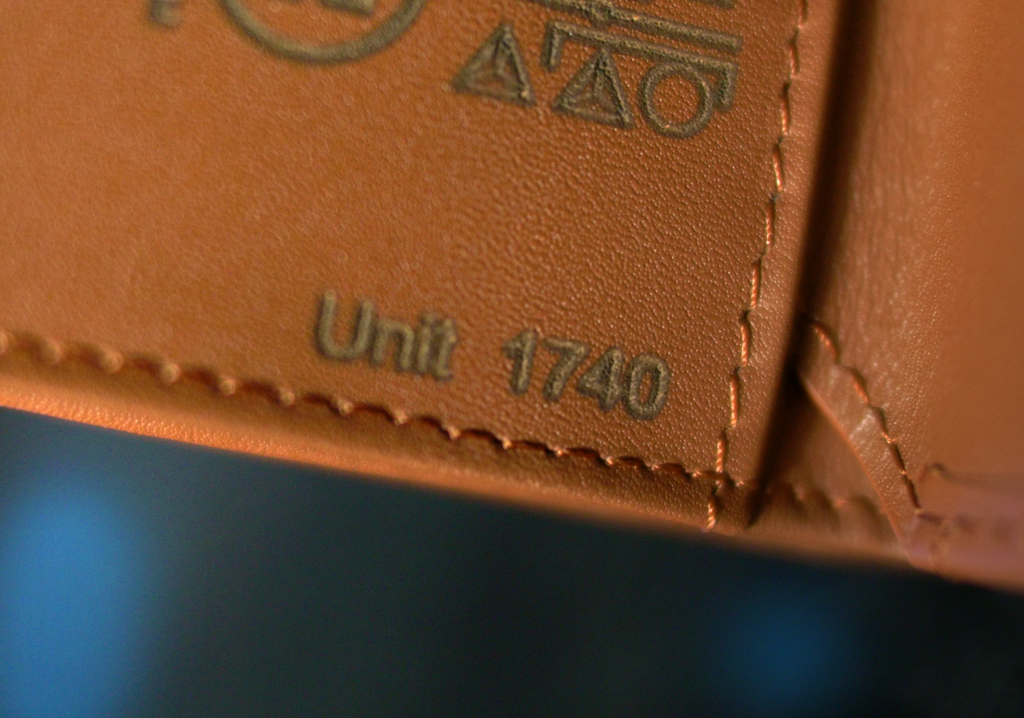 Each wallet is individually laser-etched with its unique unit number. The first wallet printed is labeled "Unit 0001", the second "Unit 0002", and so on.