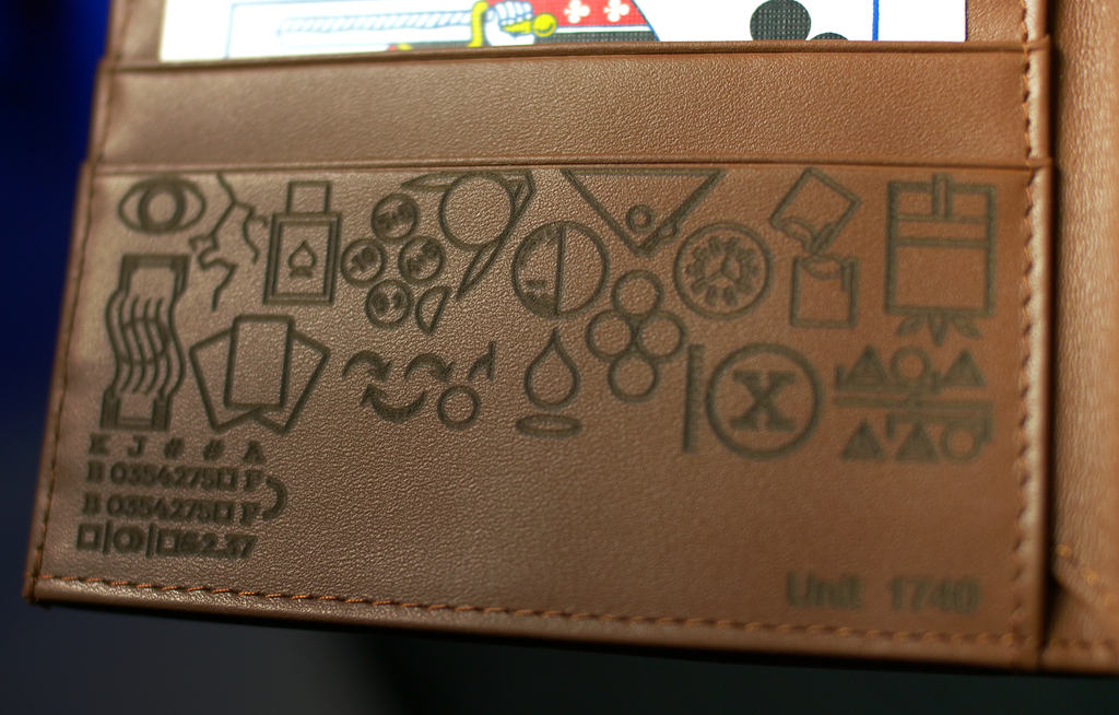 Additionally, as a part of the Rogue's Line, the wallet features 20 glyphs on one of its inside panels, representing the wallet's hidden features as well as a variety of money-related Scam School effects that you can pull off with bills and coins.